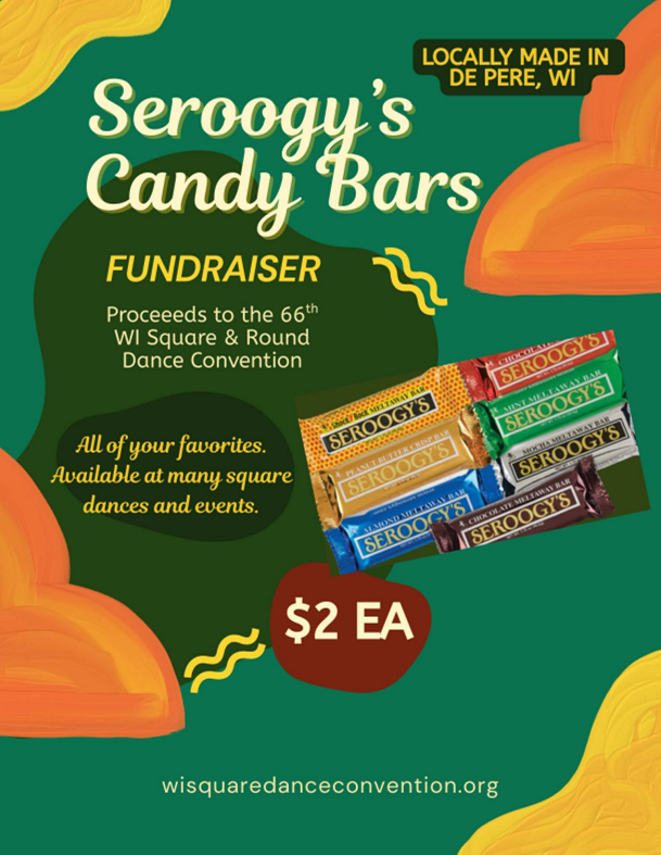 Locally made in DePere, WI, Seroogy's Candy Bars are available for purchase at local dances. Proceeds will go tot he 66th WI Square and Round Dance Convention. Flavors are: Shock Rock Meltaway, Peanut Butter Crisp Meltaway, Almond Meltaway, Chocoloate Meltaway, Chocoloate Crisp Meltaway, Chocolate Mint Meltaway and Mocha Meltaway