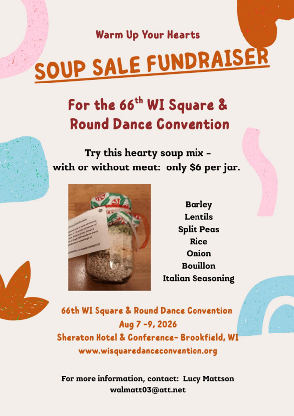 Soup In A Jar is only $6. If interested in a jar, they are available at various dances, meetings, and jamborees or contact Lucy Mattson to order